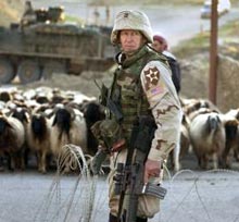 A herd of sheep approaches US Army soldiers at a checkpoint on the outskirts of Mosul