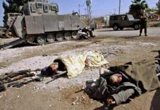 An Israeli officer stands near the bodies of Assadi (L) and Ashqar in the West Bank town of